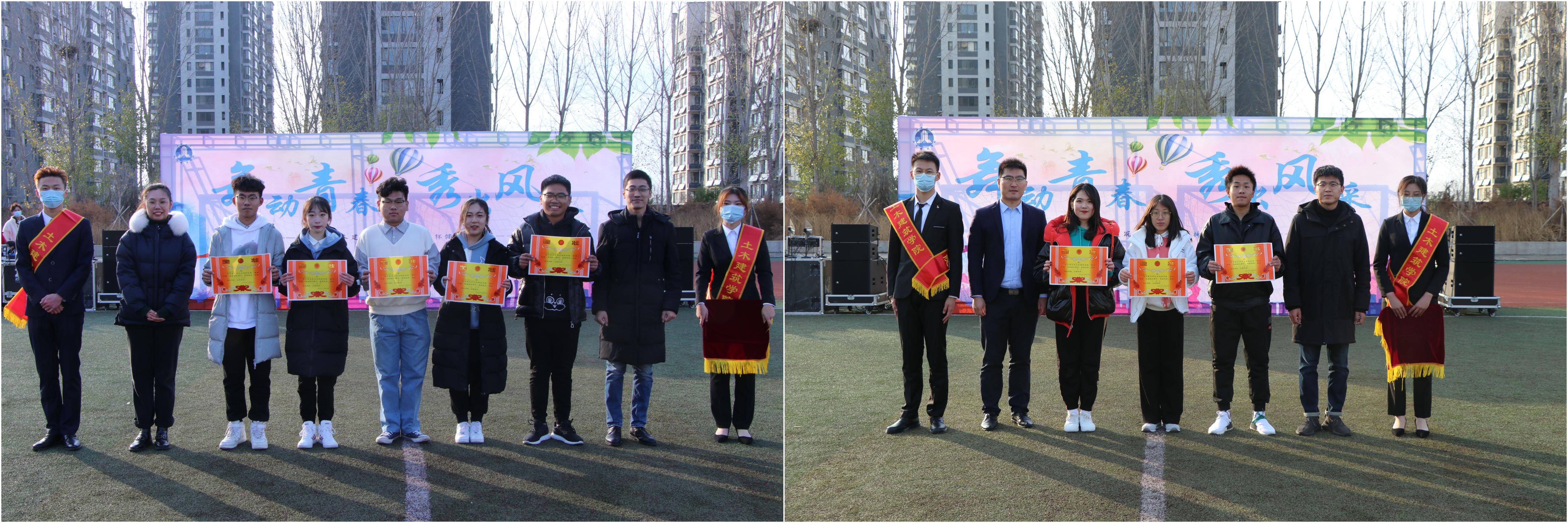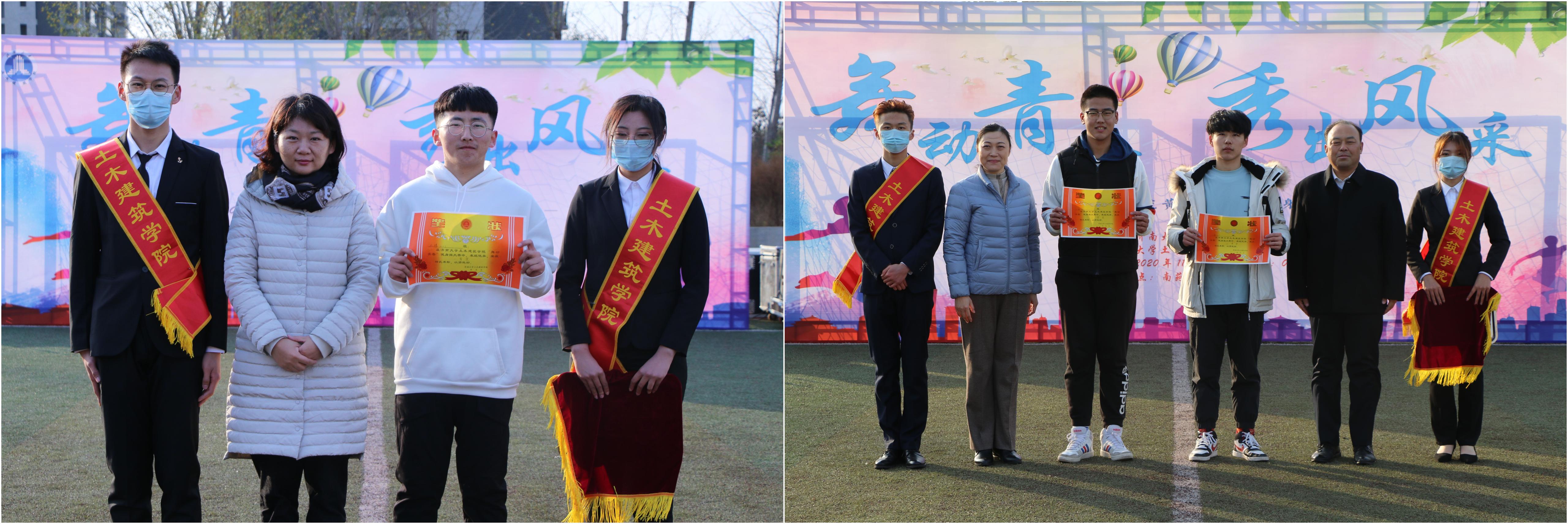 本次健身操大赛特邀济南大学大学生艺术团进行开场表演,在热烈的掌声中,大赛正式拉开帷幕。本次比赛共11支参赛队伍,由2020级各班学生组成,比赛出场顺序由抽签决定,各班参赛队伍的表演让在场师生领略了健身操舞的别样风采,从编排到衣饰装扮,从整体构思到动作推敲都充分展现了大学生蓬勃向上的朝气和青春活力的风采,赢得了在场观众的一致好评。评委根据参赛队伍的精神面貌、技术动作、服装搭配等多方面进行综合打分,校团委书记孙菲菲、土木建筑学院党委书记栾志强、党委副书记、副院长朱小燕、辅导员为获奖团队颁奖并合影留念。