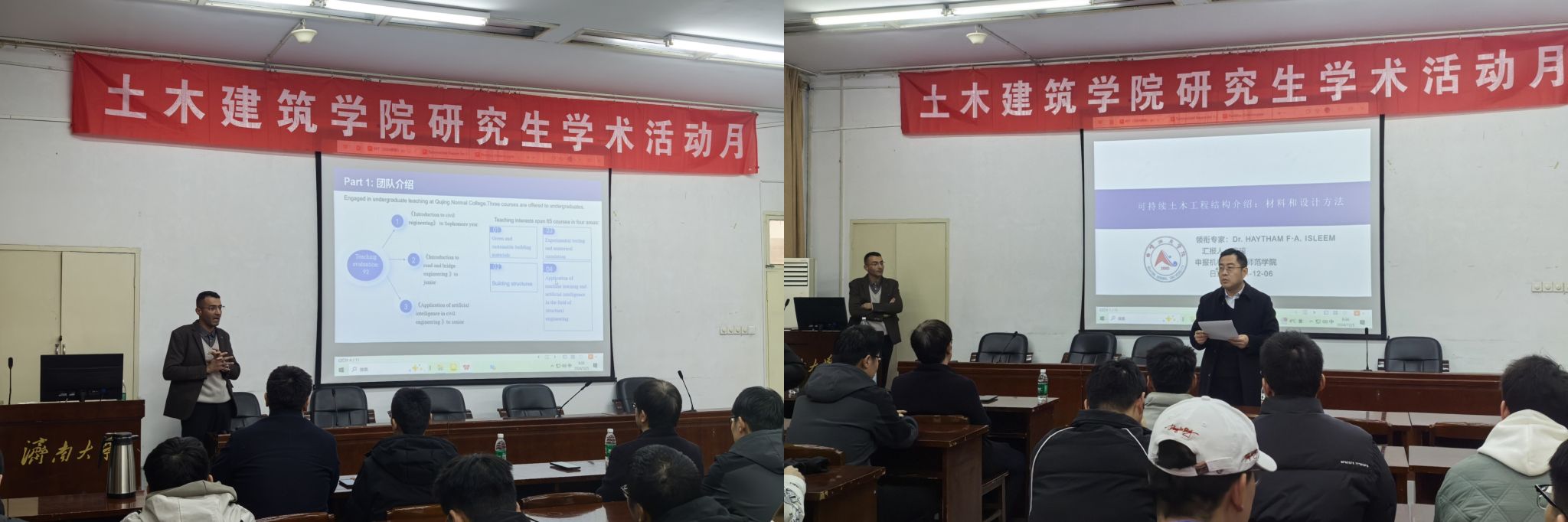 2024年12月5日,我院特邀清华大学土木工程系博士后、曲靖师范学院应用技术学院副教授Haytham F. A. Isleem作题为《可持续土木工程结构介绍:材料和设计方法》的学术报告。报告由济南大学土木建筑学院院长谢群主持,土木建筑学院相关专业师生参加了报告会。