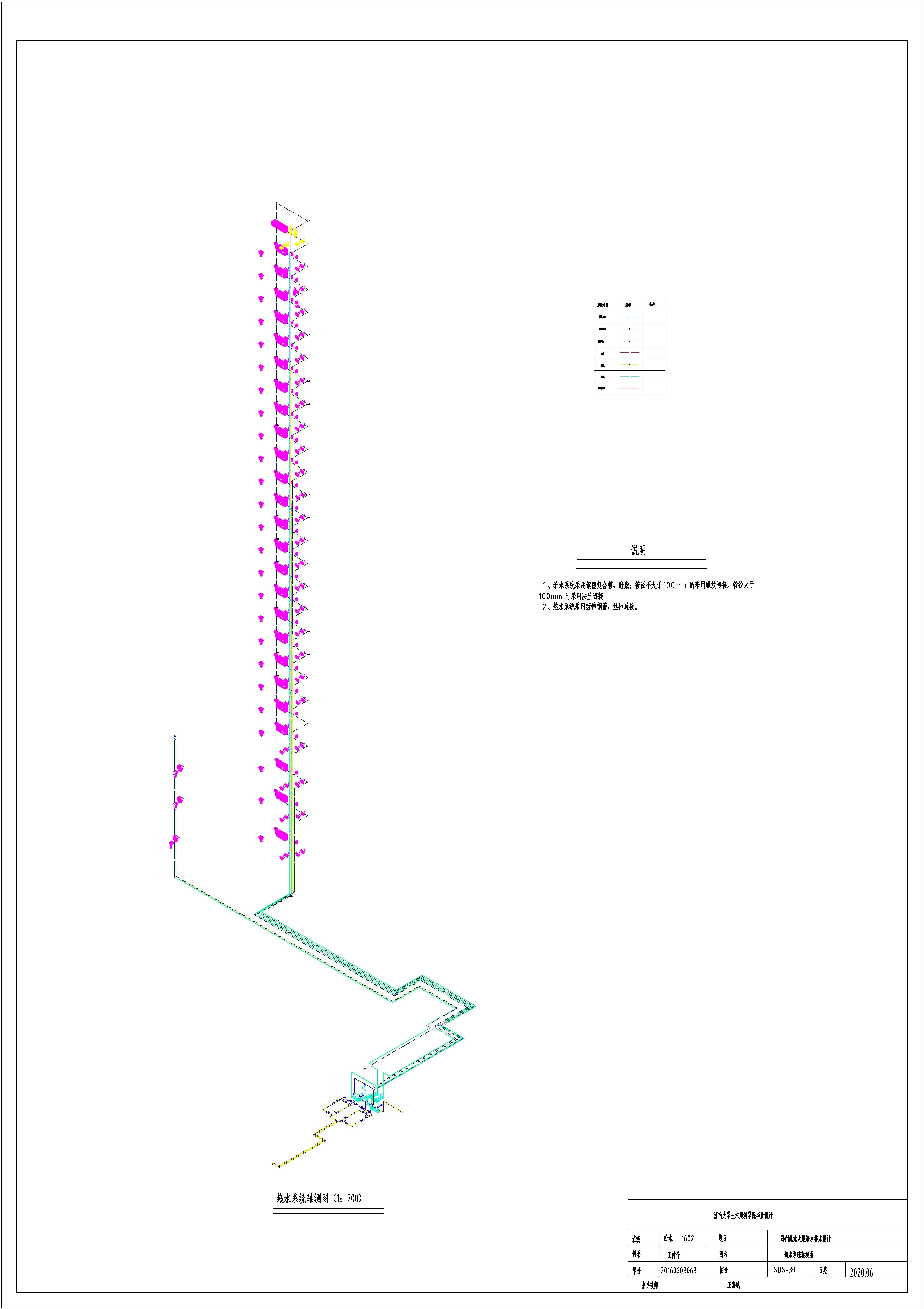 设计简介:本设计运用BIM技术进行毕业设计的全程设计,运用Revit软件进行全部设计。本设计是二十七层的综合性高层建筑的建筑给水排水设计,其中包含:给水系统、排水系统、雨水系统、自动喷淋灭火系统,消防栓系统以及热水包括热水循环系统。给水系统采用竖向分区,分为高、中、低三个区进行供给。一层到三层为低区,由市政管网直接供水;地上四层到地上十五层为中区,由生活泵房内的变频水泵直接提供;十六层到二十六层为高区,由水泵房内变频水泵直接提供。排水系统采用污废水合流排放,地上二层及以上的污废水由重力自流到地下一层排出室外,地上一层单独设置排出。热水系统采用竖向分区供水,分区方式与生活给水系统分区一致,热源系统采用市政蒸汽,同时设置热水循环系统,生活泵房设置在地下一层。雨水排水系统采用单雨水斗排水系统,按照郑州当地的暴雨强度与重现期选取雨水计算参数,进行雨水的设计,流入室外雨水检查井,并排入雨水管网。消防系统用水采用消防水池,消防水池放置在地下二层中。消防水箱设置在屋顶机房层。消火栓系统水平管各层成环,自动喷淋灭火系统由地下二层消防水泵直接供水,与室内消防栓灭火系统共用消防水泵。