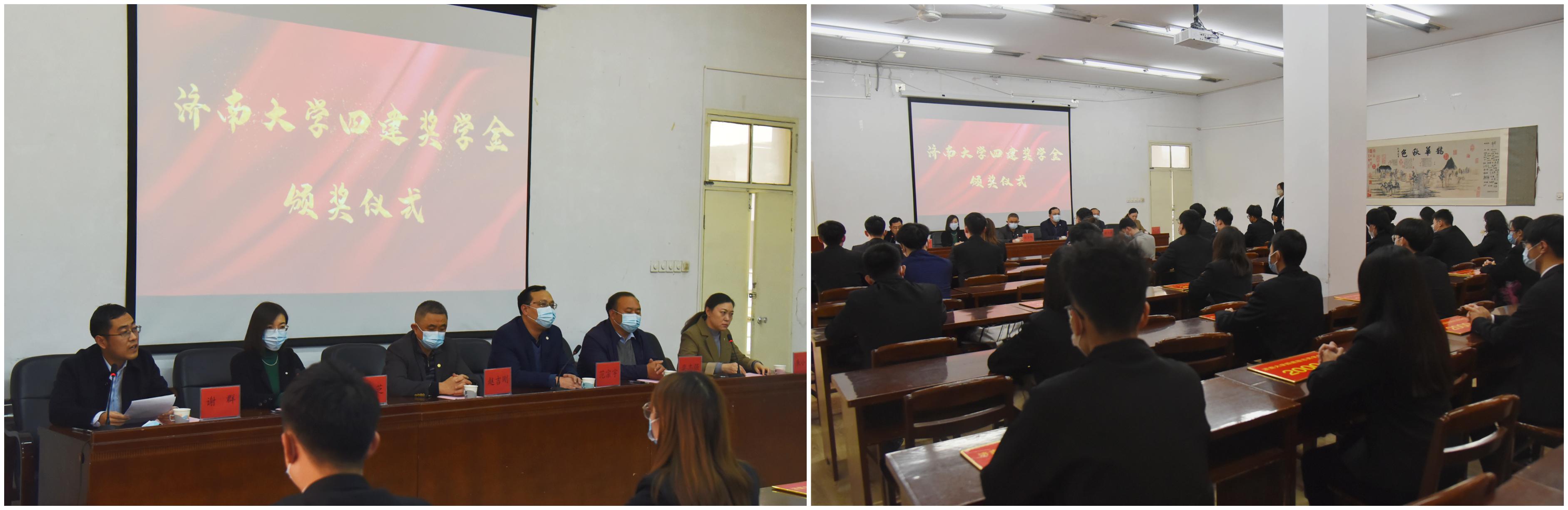 济南大学党委学生工作部(处)副部(处)长刘芝宣读表彰决定。随后,与会嘉宾和领导为获奖学生依次颁发四建勤奋奖学金、四建励志奖学金。获奖学生代表张祥龙表达了对四建集团、对老师培养教育的感谢,他表示要以优秀校友济南四建集团曹晓岩董事长为榜样,做一名勇挑重担、敢于担当的追梦人。济南四建(集团)有限责任公司人力资源部部长范宗宇在讲话中表示,近年来济南大学与济南四建(集团)有限责任公司保持着全天候的合作,先后有超过三百多名济大学子加盟济南四建集团,数十名济大学子已走向四建集团各层级领导岗位,成为推动企业快速发展的中流砥柱。未来,济南四建(集团)有限责任公司与济南大学将继续在科研开发,包括BIM技术、建筑产业化、超峰建筑、建筑智能化、轨道交通技术等新技术方面加大交流协作,深化校企合作内涵。土木建筑学院院长谢群向一直以来关心和支持学院发展的济南四建(集团)有限责任公司表示诚挚的感谢,向获得奖学金的同学表示祝贺。多年来,济南大学和济南四建密切合作,携手共进,取得了校企合作的丰硕成果。济南四建集团一直高度关注济大学子的成长成才,为我校毕业生提供大量高质量的就业岗位。谢群院长希望同学们常怀感恩之心,砥砺前行,努力成长为社会急需的高质量复合型人才,为国家建设事业做出更大的贡献。最后,谢群院长期盼济南四建集团与我校继续密切合作,团结一心,守望相助,共克时艰。