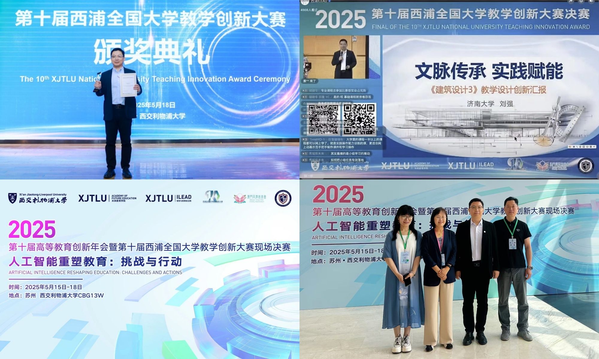 5月17日至18日,第十届西浦全国大学教学创新大赛在西交利物浦大学举办,我刘强教授团队以《文脉传承、实践赋能的〈建筑设计3〉教学创新》获得一等奖。