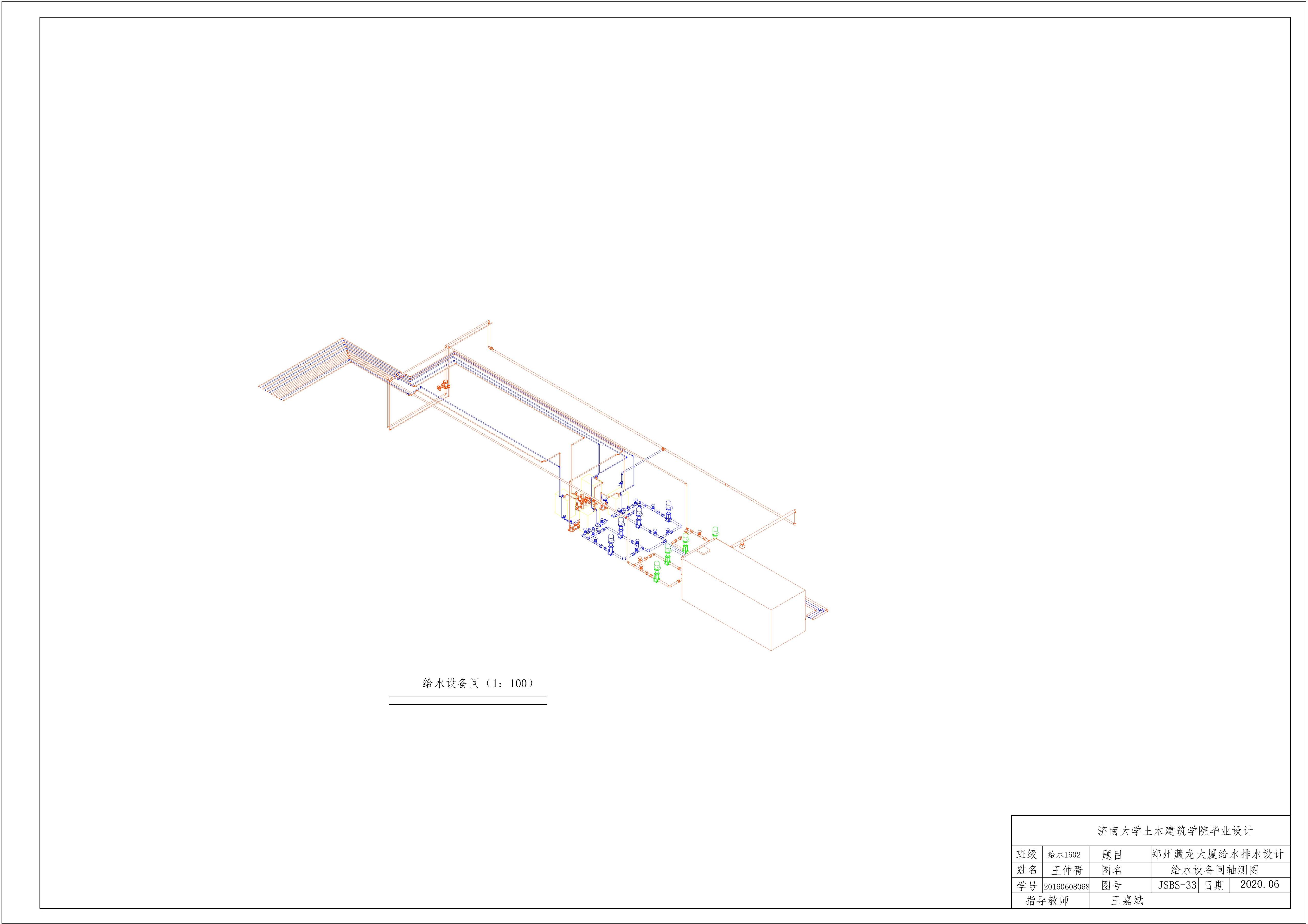 设计简介:本设计运用BIM技术进行毕业设计的全程设计,运用Revit软件进行全部设计。本设计是二十七层的综合性高层建筑的建筑给水排水设计,其中包含:给水系统、排水系统、雨水系统、自动喷淋灭火系统,消防栓系统以及热水包括热水循环系统。给水系统采用竖向分区,分为高、中、低三个区进行供给。一层到三层为低区,由市政管网直接供水;地上四层到地上十五层为中区,由生活泵房内的变频水泵直接提供;十六层到二十六层为高区,由水泵房内变频水泵直接提供。排水系统采用污废水合流排放,地上二层及以上的污废水由重力自流到地下一层排出室外,地上一层单独设置排出。热水系统采用竖向分区供水,分区方式与生活给水系统分区一致,热源系统采用市政蒸汽,同时设置热水循环系统,生活泵房设置在地下一层。雨水排水系统采用单雨水斗排水系统,按照郑州当地的暴雨强度与重现期选取雨水计算参数,进行雨水的设计,流入室外雨水检查井,并排入雨水管网。消防系统用水采用消防水池,消防水池放置在地下二层中。消防水箱设置在屋顶机房层。消火栓系统水平管各层成环,自动喷淋灭火系统由地下二层消防水泵直接供水,与室内消防栓灭火系统共用消防水泵。
